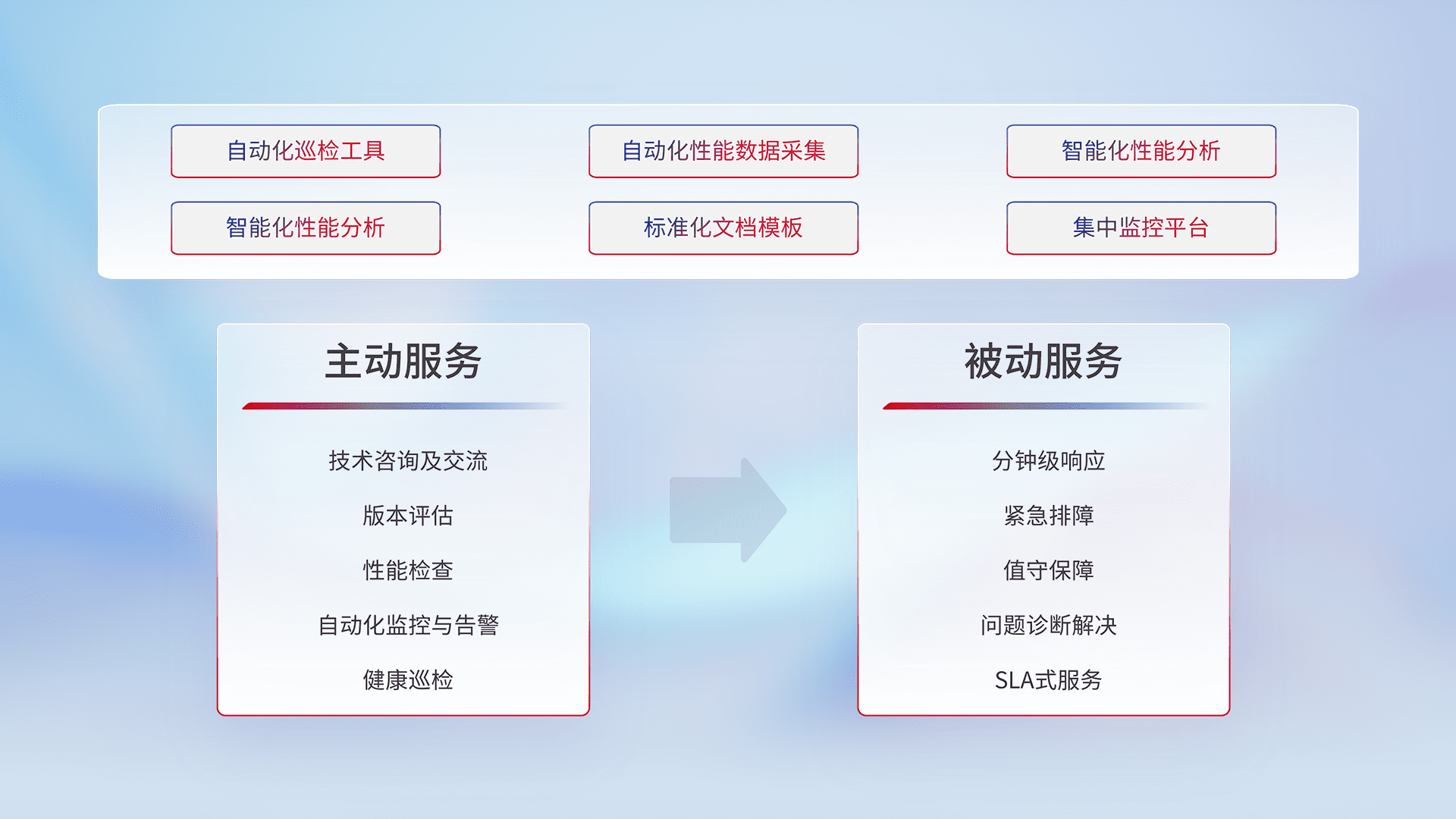 智能化工具和标准化文档,,,保障服务质量,,提供主动服务(包含技术咨询、、、版本评估、、性能检查、、、自动化监控与告警、、、健康巡检)和被动服务包含(分钟级响应、、、、紧急排障、、、值守保障、、、问题诊断解决、、、、SLA服务)。。。。