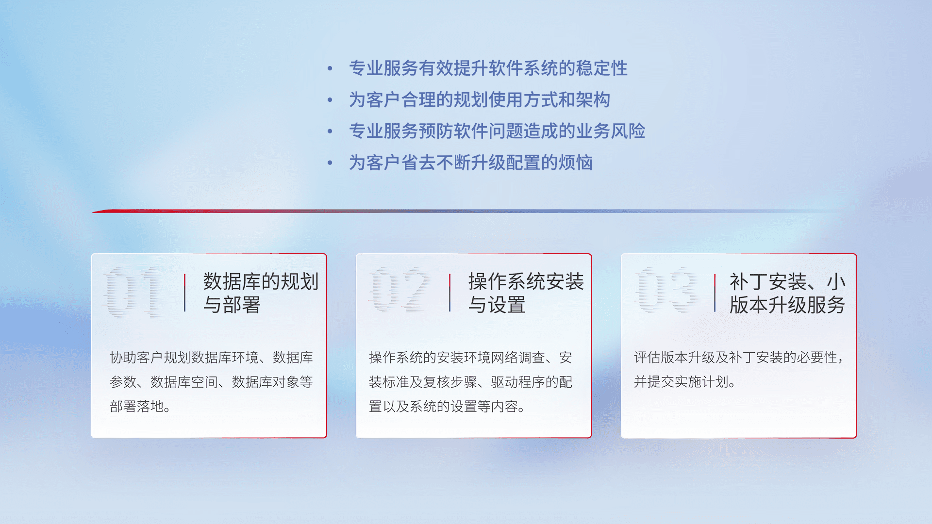 为客户提供软件规模升级、、快速部署、、、按需配置的专业服务,,,,从数据库的规划与部署到操作系统的安装与设置,,再到补丁安装和小版本升级提供支持。。。
